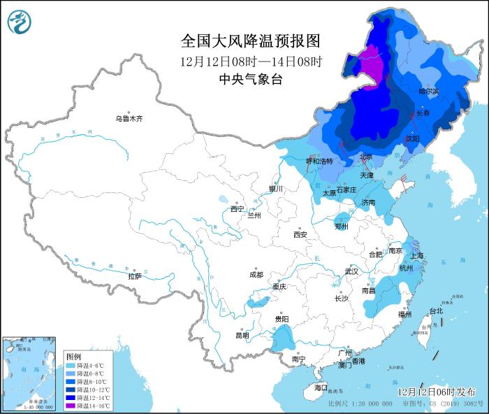 其中,12月12日08時至14日08時,內(nèi)蒙古中東部、東北地區(qū)大部、華北中北部、山東中部、河南北部、江南中東部等地氣溫將下降4~8℃,其中,內(nèi)蒙古東部、河北北部、遼寧西部、吉林西部等地部分地區(qū)降溫幅度可達(dá)10℃以上;上述部分地區(qū)并有4~6級偏北風(fēng),陣風(fēng)7~8級。中央氣象臺12月12日06時繼續(xù)發(fā)布大風(fēng)降溫預(yù)報。