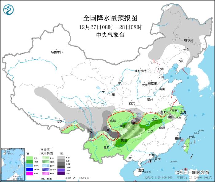 12月27日08時(shí)至28日08時(shí),內(nèi)蒙古東部、黑龍江和吉林大部、西藏東部、湖北西部、湖南西部、貴州中北部、重慶東南部、川西高原、云南北部以及安徽大別山區(qū)和皖南山區(qū)等地部分地區(qū)有小到中雪,其中,安徽皖南山區(qū)、湖北西南部、川西高原南部、重慶東南部、貴州西北部、云南北部等地部分地區(qū)有大到暴雪(10~15毫米)。湖北中東部、湖南中東部、安徽南部、江蘇南部、浙江北部、江西西北部、廣西中西部、云南中南部、臺灣島等地部分地區(qū)有小到中雨。內(nèi)蒙古中部、河北北部部分地區(qū)有4~5級風(fēng)。東海南部海域、臺灣海峽、巴士海峽、南海大部海域、北部灣將有6~7級、陣風(fēng)8級的偏北或東北風(fēng),其中臺灣海峽、南海東北部的部分海域風(fēng)力可達(dá)8級、陣風(fēng)9級(見圖2)。