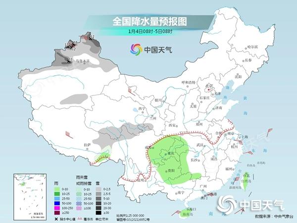今起三天,我國(guó)降水區(qū)域仍將集中在西南地區(qū),新疆等部分地區(qū)降雪也比較頻繁。其中今天,新疆北部、西藏東南部、青海中部、甘肅南部、陜西西南部等地部分地區(qū)有小到中雪或雨夾雪,其中,新疆北疆北部等高海拔地區(qū)有大到暴雪(10~16毫米)。四川盆地、重慶西部、貴州中西部、云南東部、海南島、臺(tái)灣島等地部分地區(qū)有小雨。