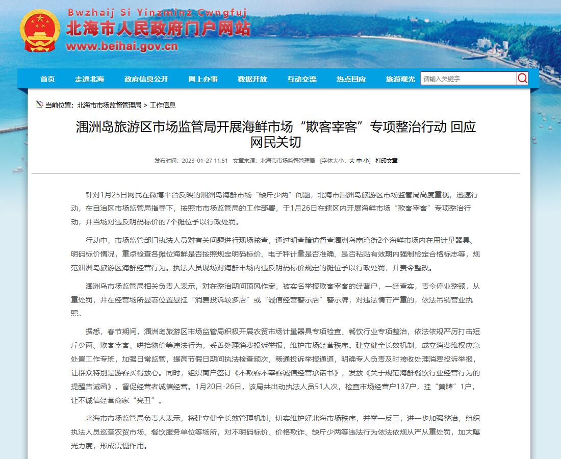 潿洲島市場監(jiān)管局相關負責人表示,對在整治期間頂風作案,被實名舉報欺客宰客的經營戶,一經查實,責令停業(yè)整頓,從重處罰,并在經營場所顯著位置懸掛“消費投訴較多店”或“誠信經營警示店”警示牌,對違法情節(jié)嚴重的,依法吊銷營業(yè)執(zhí)照。