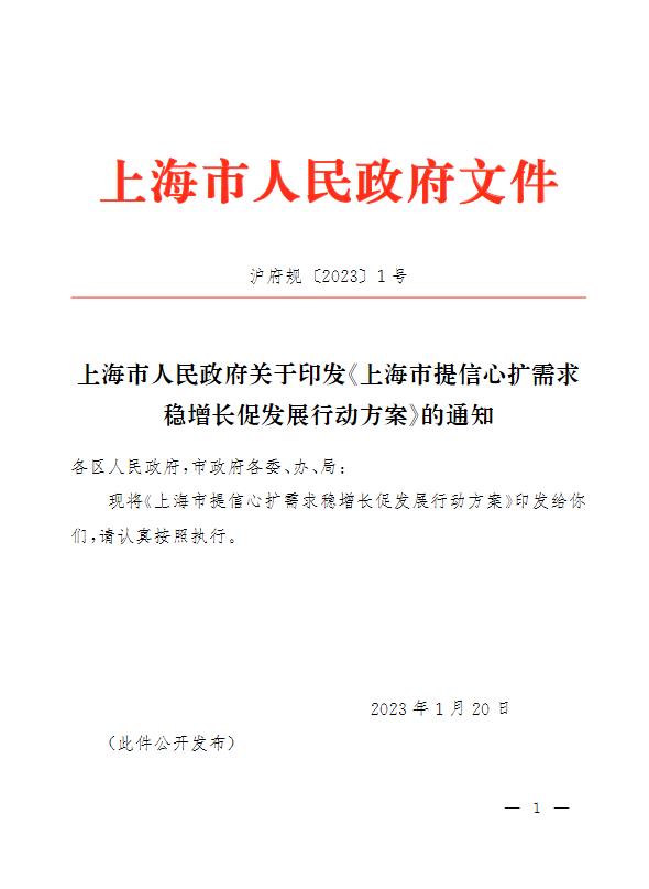 中新網(wǎng)1月29日電 據(jù)上海發(fā)布微信公眾號29日消息,為全面貫徹黨的二十大和中央經(jīng)濟工作會議精神,落實市第十二次黨代會和十二屆市委二次全會部署,抓牢高質(zhì)量發(fā)展首要任務,大力提振市場預期和信心,推動經(jīng)濟社會發(fā)展開好局起好步,近期上海市制定了《上海市提信心擴需求穩(wěn)增長促發(fā)展行動方案》(以下簡稱《行動方案》)。