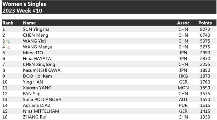 女單方面,孫穎莎以8270分領(lǐng)先,穩(wěn)居第一,陳夢(mèng)6740分位居第二,王藝迪5375分位列第三,王曼昱排名第四。日本選手伊藤美誠以2990分排在第五位。
