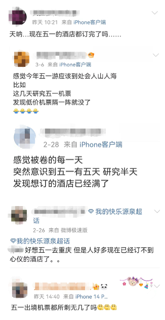 社交平臺上,多名網(wǎng)友早已規(guī)劃好了自己“五一”出行的計劃,并已提前購買機票和酒店,面對緊俏的旅游產(chǎn)品,有網(wǎng)友驚呼:“現(xiàn)在就已經(jīng)訂不到房了嗎?”“低價機票隔一會兒就沒了!”