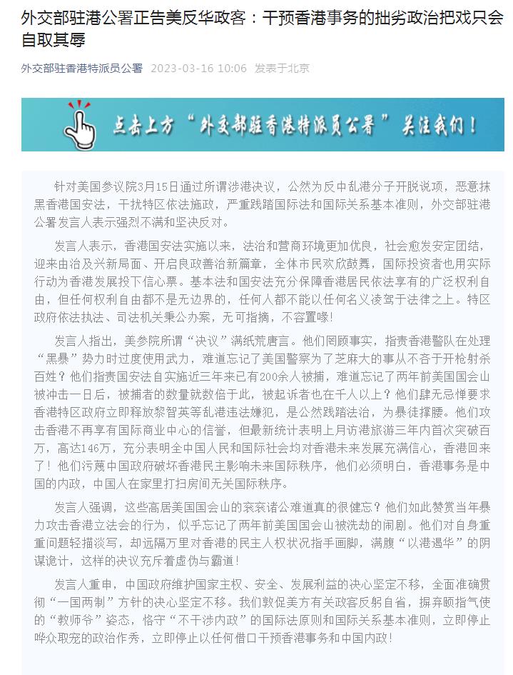 中新網(wǎng)3月16日電 據(jù)外交部駐港公署微信公眾號消息,針對美國參議院3月15日通過所謂涉港決議,公然為反中亂港分子開脫說項(xiàng),惡意抹黑香港國安法,干擾特區(qū)依法施政,嚴(yán)重踐踏國際法和國際關(guān)系基本準(zhǔn)則,外交部駐港公署發(fā)言人表示強(qiáng)烈不滿和堅決反對。