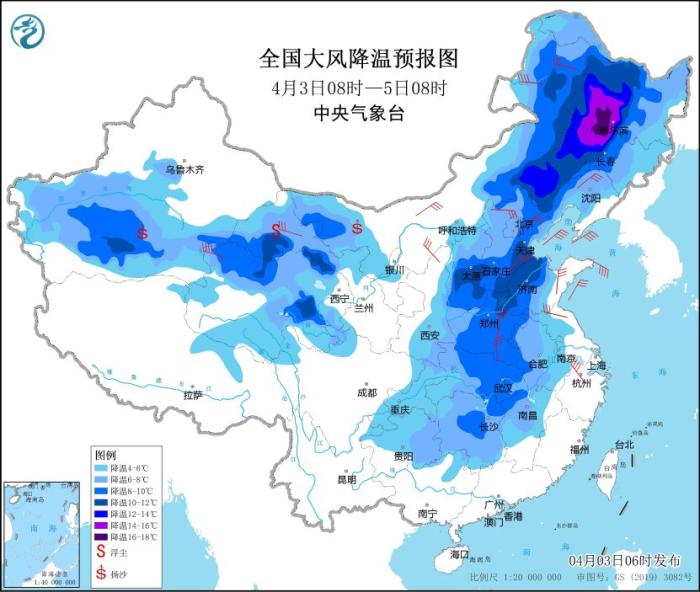 受較強(qiáng)冷空氣影響,4月3日08時(shí)至5日08時(shí),新疆南疆盆地、西北地區(qū)中部、內(nèi)蒙古西部和東北部、華北、東北地區(qū)、黃淮、江漢、江淮中西部、江南中西部等地氣溫將下降4~8℃,其中,內(nèi)蒙東北部、東北地區(qū)西部、華北南部等地局地降溫幅度可達(dá)10℃以上;上述部分地區(qū)并有5~6級(jí)偏北風(fēng),陣風(fēng)7~9級(jí)。新疆南部和東部、內(nèi)蒙古西部、甘肅西部等地有沙塵天氣(見圖1)。3日夜間,渤海、黃海西南部海域、東海西北部海域、長(zhǎng)江口附近海域?qū)⒂?級(jí)、陣風(fēng)9級(jí)的大風(fēng),其中渤海灣將有9級(jí)、陣風(fēng)10級(jí)的大風(fēng)。中央氣象臺(tái)4月3日06時(shí)繼續(xù)發(fā)布大風(fēng)降溫預(yù)報(bào)和海上大風(fēng)黃色預(yù)警。