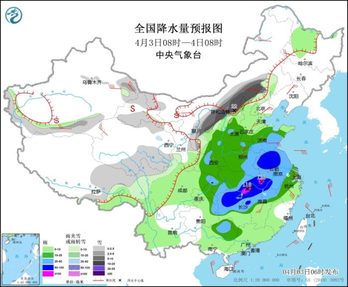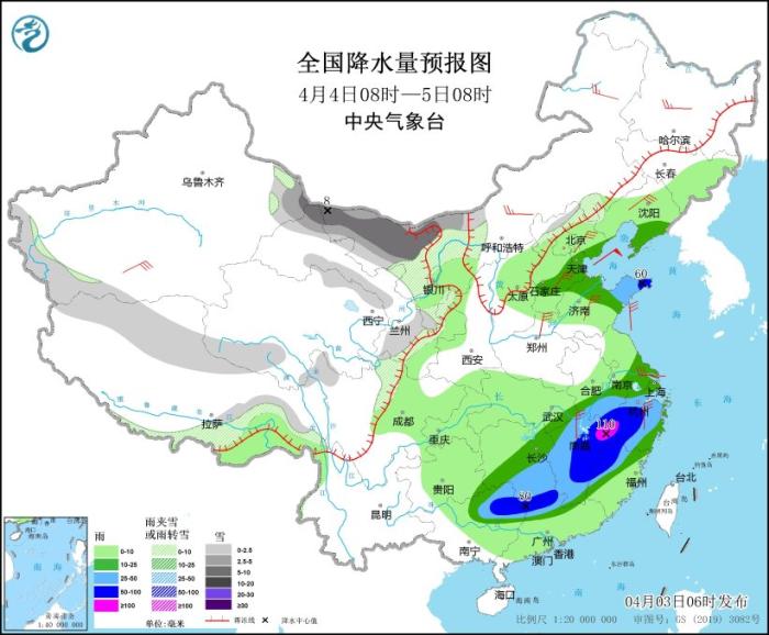 4月3日08時(shí)至4日08時(shí),新疆南疆盆地和東部、西藏東部、西北地區(qū)中部和東北部、內(nèi)蒙古中部、川西高原北部、陜西北部、山西北部、河北北部等地部分地區(qū)有小到中雪或雨夾雪,其中,內(nèi)蒙古中部、河北西北部等地部分地區(qū)有大到暴雪,局地大暴雪(20~22毫米)。湖北東部和南部、湖南北部、江西北部、安徽、河南東部、山東南部、江蘇及陜西中部、山西中部、重慶北部、廣西東北部等地有大到暴雨,其中,安徽西南部、湖北東部、湖南北部等地部分地區(qū)有大暴雨(100~130毫米)。內(nèi)蒙古、東北地區(qū)西部、新疆南部、華北、黃淮、江淮等地部分地區(qū)有4~6級(jí)風(fēng),局部有6~7級(jí)風(fēng)(見圖3)。渤海、黃海西南部、東海西北部、長(zhǎng)江口附近海域?qū)⒂?級(jí)、陣風(fēng)9級(jí)的大風(fēng),其中渤海灣將有9級(jí)、陣風(fēng)10級(jí)的大風(fēng)。