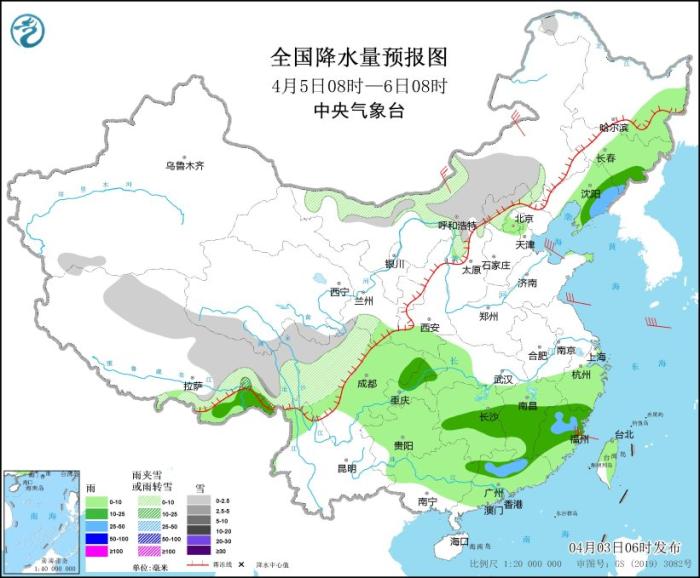 4月5日08時(shí)至6日08時(shí),內(nèi)蒙古西部、西藏北部和東部、青海南部、山西北部、河北北部、川西高原北部等地部分地區(qū)有小雪或雨夾雪。西藏東南部、東北地區(qū)東部、西南地區(qū)東部、江漢西部、江南、華南大部、臺(tái)灣島等地部分地區(qū)有小到中雨,其中,遼寧東南部、廣東中北部、福建中部等地部分地區(qū)有大雨,局部有暴雨。內(nèi)蒙古中西部等地部分地區(qū)有4~6級(jí)風(fēng)(見圖5)。
