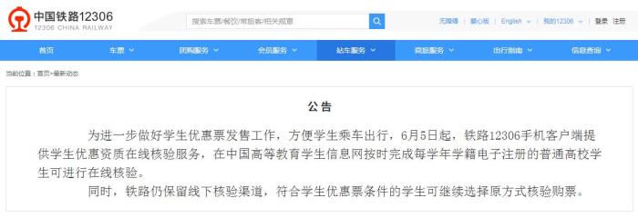 12306手機客戶端5日起提供學(xué)生優(yōu)惠資質(zhì)在線核驗服務(wù)