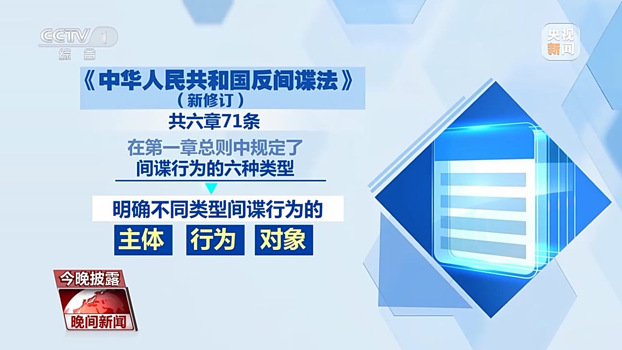 國家安全是安邦定國的重要基石。近年來,我國面臨的安全威脅日趨多元,反間諜斗爭形勢也更加嚴峻復(fù)雜。從本月起,新修訂的《反間諜法》開始施行。新法對間諜行為,做出進一步充實和細化。那么按照新法,哪些行為將被認定為間諜行為?作為普通群眾,一旦發(fā)現(xiàn)間諜行為,又該如何處理呢?今晚披露,一塊來關(guān)注。