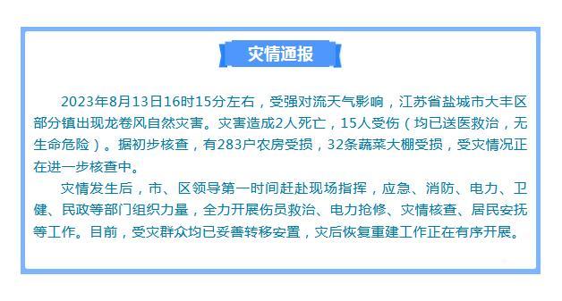 中新網(wǎng)8月13日電 據(jù)江蘇鹽城大豐區(qū)委區(qū)政府官方微信消息,8月13日16時15分左右,受強對流天氣影響,江蘇省鹽城市大豐區(qū)部分鎮(zhèn)出現(xiàn)龍卷風自然災害。災害造成2人死亡,15人受傷(均已送醫(yī)救治,無生命危險)。據(jù)初步核查,有283戶農房受損,32條蔬菜大棚受損,受災情況正在進一步核查中。