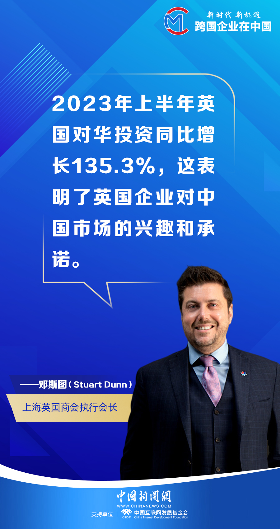鄧斯圖表示,2023年上半年英國對華投資同比增長135.3%,這表明了英國企業(yè)對中國市場的興趣和承諾。