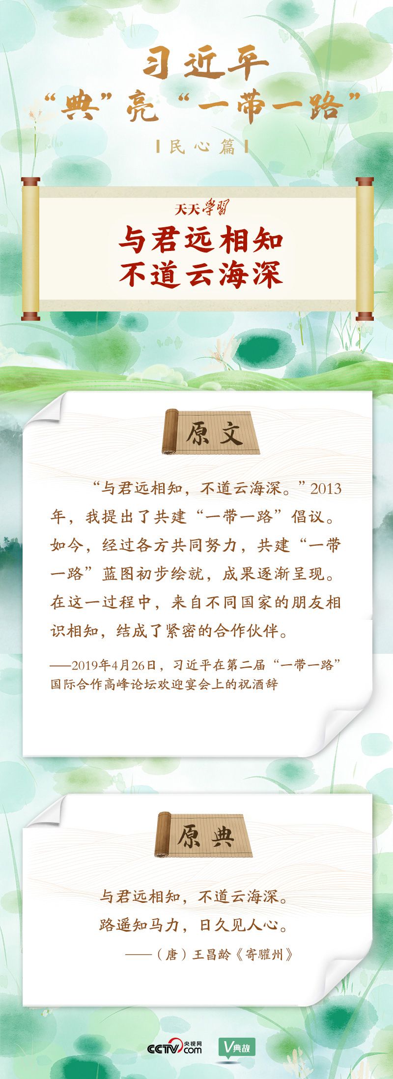 在國內國際多個重要場合,習近平主席頻頻引經(jīng)據(jù)典,介紹“一帶一路”承載的厚重歷史,闡述“一帶一路”建設的理念和重大意義,描繪“一帶一路”美好的發(fā)展愿景。央視網(wǎng)《天天學習》欄目特選取習近平主席的部分用典,與您一起學習領會。