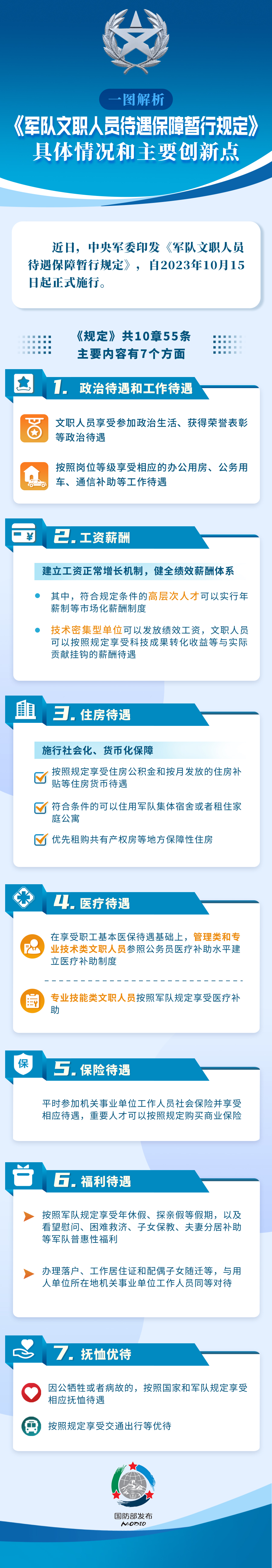 六是福利待遇。按照軍隊(duì)規(guī)定享受年休假、探親假等假期,以及看望慰問、困難救濟(jì)、子女保教、夫妻分居補(bǔ)助等軍隊(duì)普惠性福利。辦理落戶、工作居住證和配偶子女隨遷等,與用人單位所在地機(jī)關(guān)事業(yè)單位工作人員同等對(duì)待。