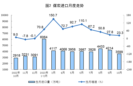 原煤生產(chǎn)增速加快,進(jìn)口較快增長。10月份,生產(chǎn)原煤3.9億噸,同比增長3.8%,增速比9月份加快3.4個百分點(diǎn),日均產(chǎn)量1254.0萬噸。進(jìn)口煤炭3599萬噸,同比增長23.3%,增速比9月份回落4.5個百分點(diǎn)。