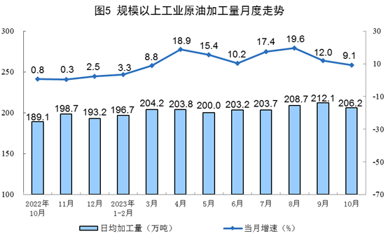 原油加工保持穩(wěn)定增長。10月份,加工原油6393萬噸,同比增長9.1%,增速比9月份放緩2.9個百分點(diǎn),日均加工原油206.2萬噸。1—10月份,加工原油61876萬噸,同比增長11.2%。
