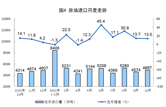 原油生產(chǎn)增速略有加快,進(jìn)口保持較快增長。10月份,生產(chǎn)原油1733萬噸,同比增長0.5%,增速比9月份加快0.2個百分點(diǎn),日均產(chǎn)量55.9萬噸。進(jìn)口原油4897萬噸,同比增長13.5%,增速比9月份放緩0.2個百分點(diǎn)。