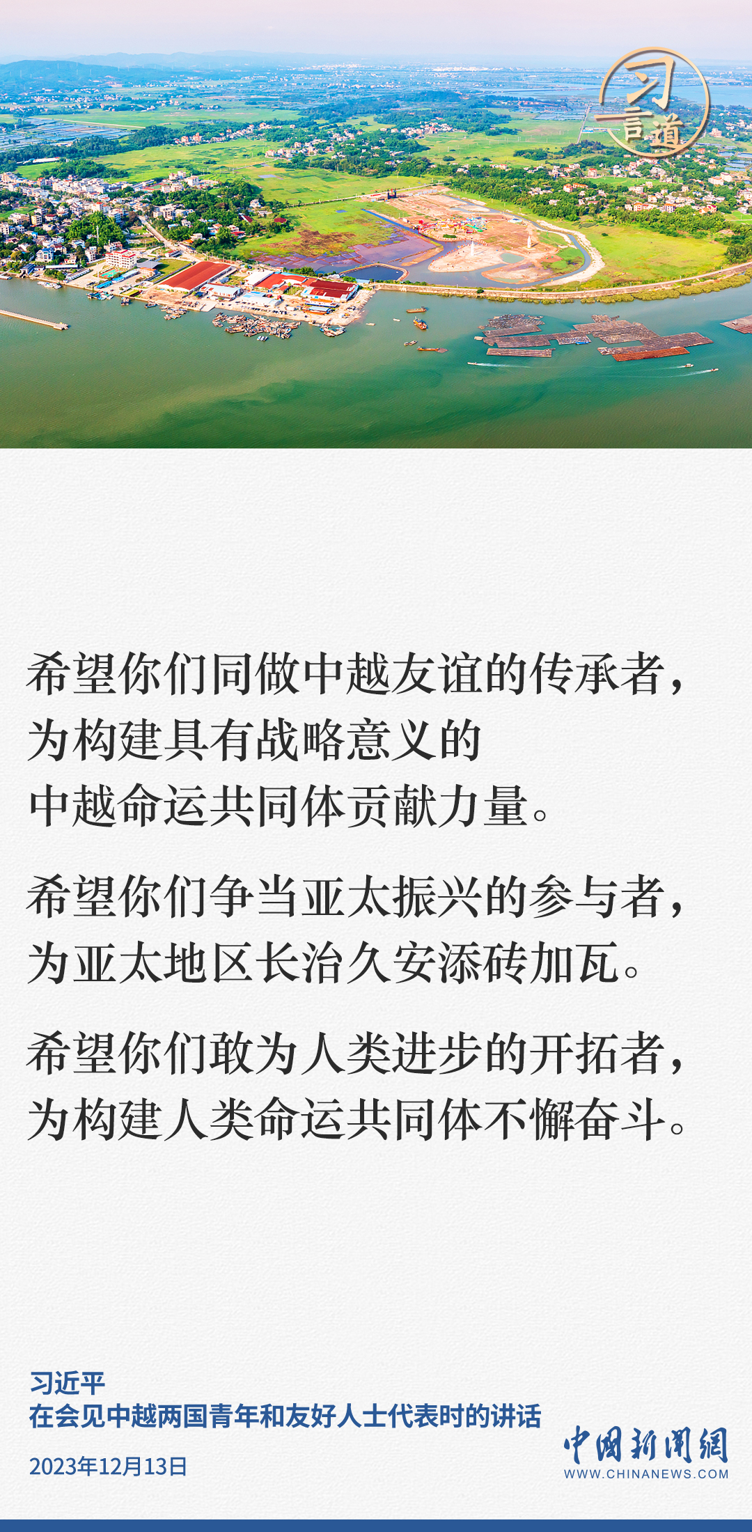 當(dāng)?shù)貢r間12月13日下午,中共中央總書記、國家主席習(xí)近平和夫人彭麗媛在河內(nèi)同越共中央總書記阮富仲夫婦共同會見中越兩國青年和友好人士代表。習(xí)近平指出——