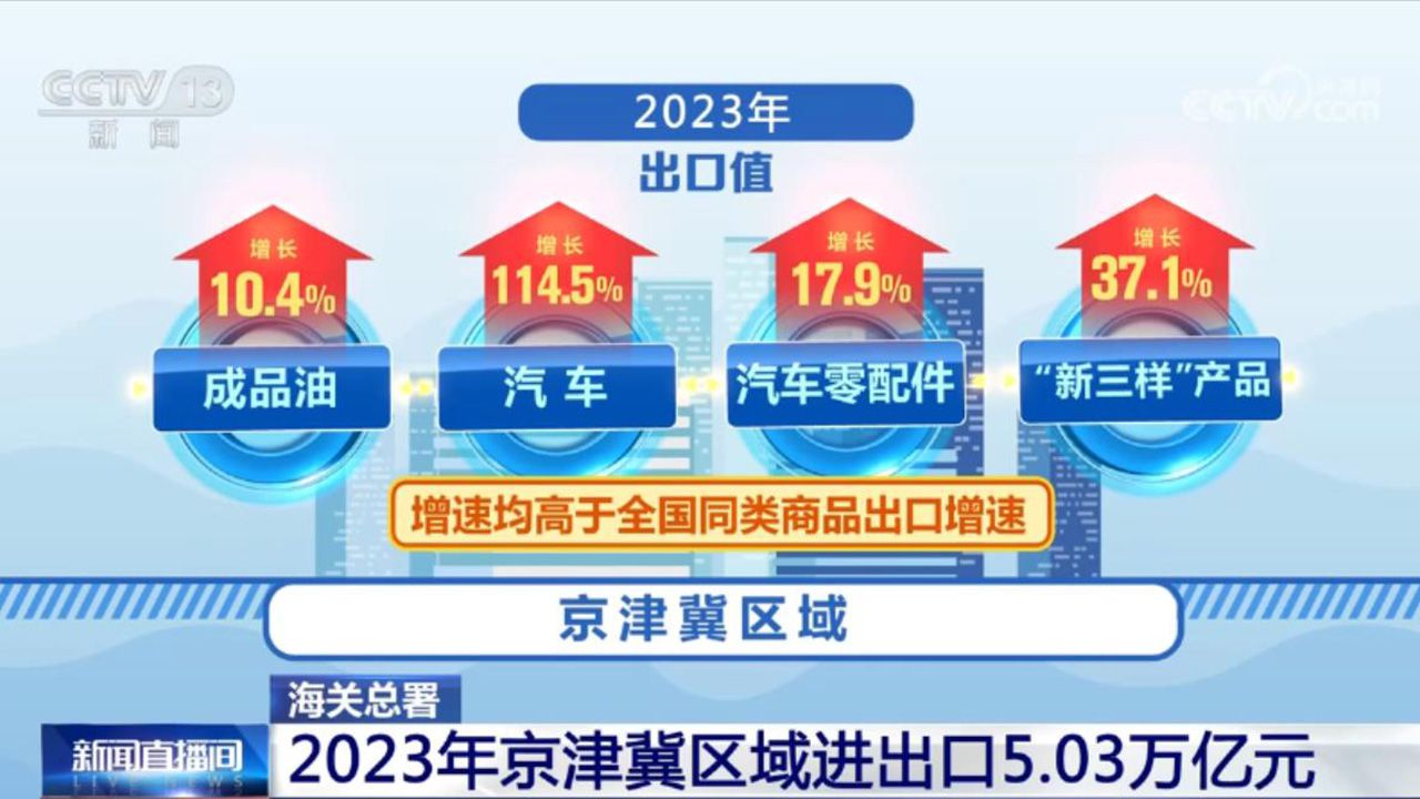 數(shù)據(jù)顯示,2023年京津冀區(qū)域進出口5.03萬億元,增長0.4%,連續(xù)三年實現(xiàn)正增長,占全國進出口總值的12%。