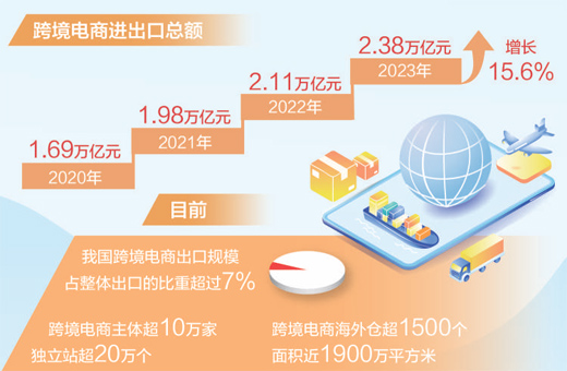 據(jù)海關(guān)測(cè)算,2023年,我國(guó)跨境電商進(jìn)出口總額2.38萬(wàn)億元,增長(zhǎng)15.6%。其中,出口1.83萬(wàn)億元,增長(zhǎng)19.6%;進(jìn)口5483億元,增長(zhǎng)3.9%。跨境電商快速發(fā)展,既滿足了國(guó)內(nèi)消費(fèi)者多樣化個(gè)性化需求,又助力我國(guó)產(chǎn)品通達(dá)全球,成為外貿(mào)發(fā)展的重要?jiǎng)幽堋?/p>