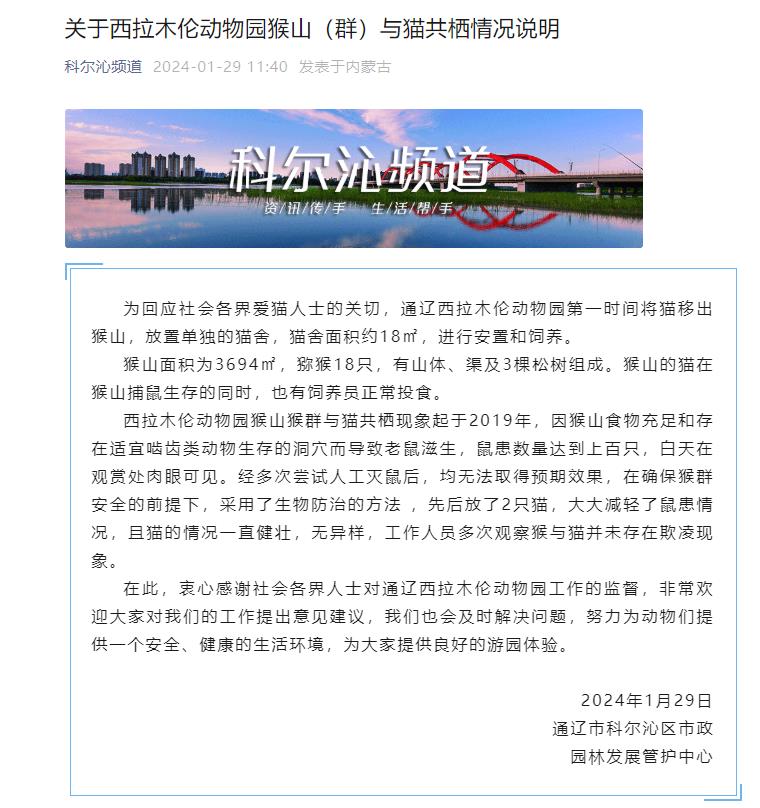中新網(wǎng)1月29日電 據(jù)內(nèi)蒙古通遼市科爾沁區(qū)融媒體中心微信公眾號(hào)消息,通遼市科爾沁區(qū)市政園林發(fā)展管護(hù)中心29日發(fā)布《關(guān)于西拉木倫動(dòng)物園猴山(群)與貓共棲情況說(shuō)明》(下稱“情況說(shuō)明”)。情況說(shuō)明顯示,通遼西拉木倫動(dòng)物園已第一時(shí)間將貓移出猴山,且貓的情況一直健壯,無(wú)異樣,工作人員多次觀察猴與貓并未存在欺凌現(xiàn)象。全文如下: