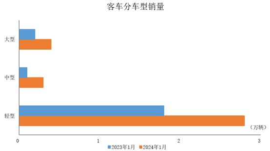 2024年1月,客車產(chǎn)銷均完成3.5萬輛,環(huán)比分別下降35.3%和36.5%,同比分別增長68.1%和63.4%。在客車細分品種中,與上月相比,三大類客車品種產(chǎn)銷均呈兩位數(shù)下降;與上年同期相比,三大類客車品種產(chǎn)銷均呈不同程度增長。