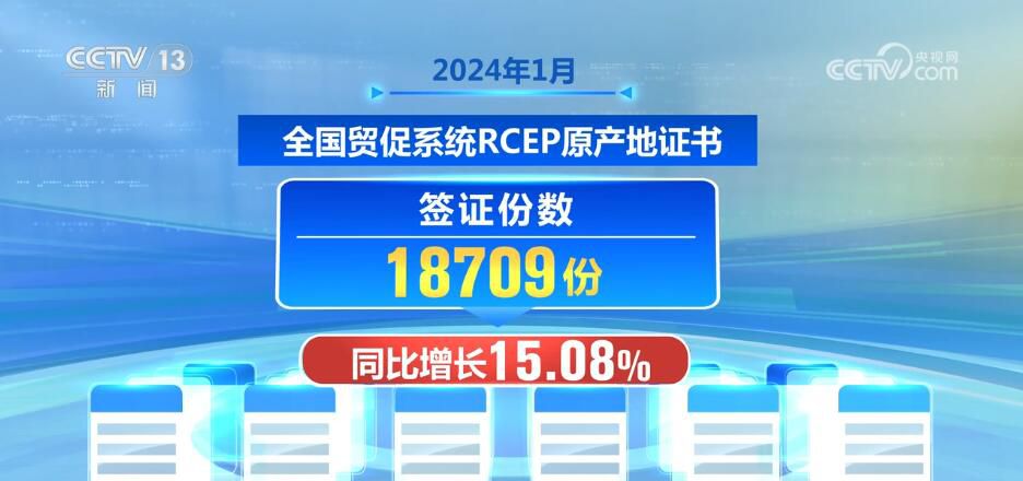 2024年1月,全國貿(mào)促系統(tǒng)RCEP原產(chǎn)地證書簽證份數(shù)為18709份,同比增長15.08%;辦證企業(yè)3640家,同比增長10.40%,出口目的國包括日本、印尼、韓國、越南等13個(gè)成員國,預(yù)計(jì)共為我國產(chǎn)品在RCEP進(jìn)口成員國減免關(guān)稅0.09億美元,RCEP的政策紅利在持續(xù)釋放。