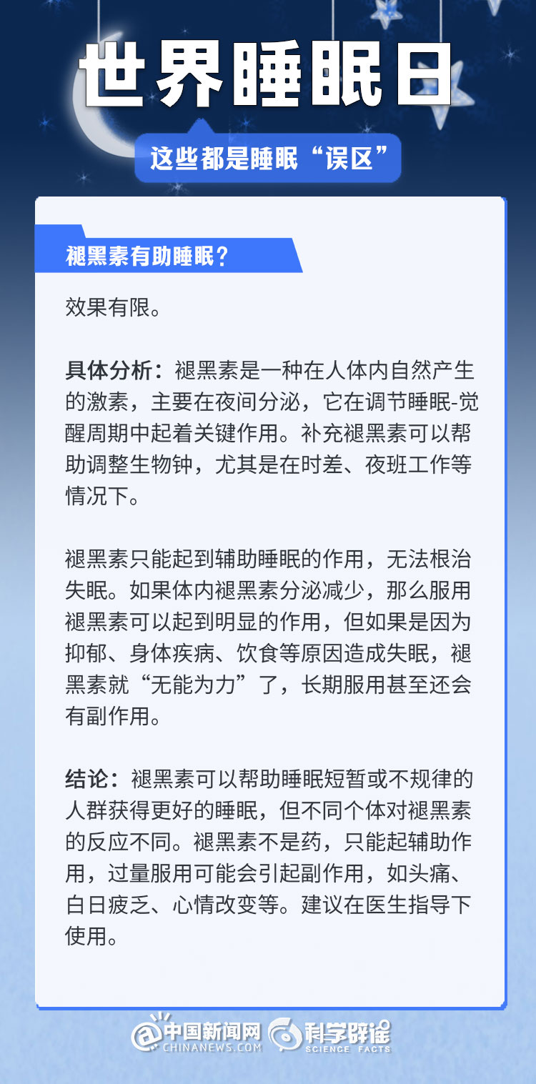 中新網(wǎng)3月21日電 《中國(guó)睡眠研究報(bào)告(2024)》顯示,2023年居民睡眠指數(shù)為62.61分,較2022年降低了5.16。去年的報(bào)告中,曾有近半數(shù)民眾每晚平均睡眠時(shí)長(zhǎng)不足8小時(shí)(47.55%)。很多人正在經(jīng)受著睡眠問(wèn)題的困擾,為了避免大家被誤導(dǎo),我們總結(jié)了幾個(gè)生活中常見(jiàn)的睡眠誤區(qū),一起來(lái)了解一下吧!(來(lái)源:科學(xué)辟謠 中國(guó)新聞網(wǎng)微博)