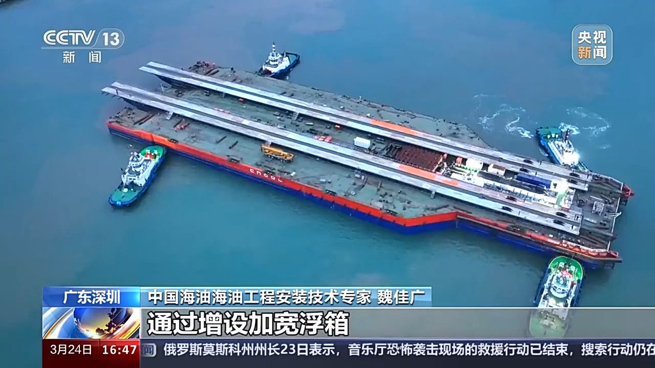中國海油深圳分公司流花油田開發(fā)項目副總經(jīng)理 王火平:由于“?;枴钡木薮髧嵨怀^世界最大起重船的吊裝能力,此次海上安裝采用滑移下水方式進行。這種方式是利用導管架自身重力并配合液壓千斤頂助推,使導管架從駁船平穩(wěn)地滑入海中,再通過導管架注水和起重船輔助相結(jié)合的方式,實現(xiàn)扶正坐底和精準就位。
