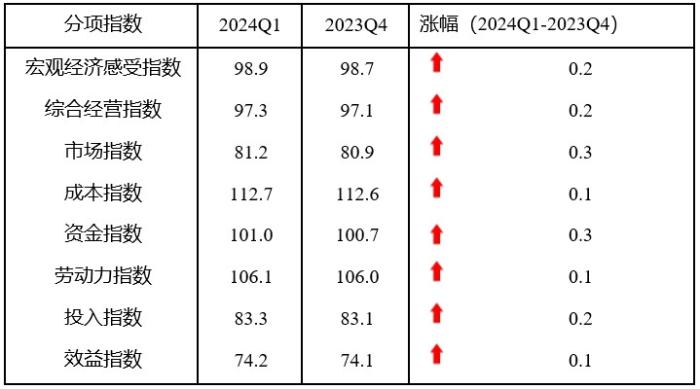 分項指數(shù)全面上升。一季度,宏觀經(jīng)濟感受指數(shù)、綜合經(jīng)營指數(shù)、市場指數(shù)、成本指數(shù)、資金指數(shù)、勞動力指數(shù)、投入指數(shù)和效益指數(shù)均止跌回升,環(huán)比分別上升0.2、0.2、0.3、0.1、0.3、0.1、0.2和0.1點。資金指數(shù)和勞動力指數(shù)處于景氣臨界值100以上,宏觀經(jīng)濟感受指數(shù)、綜合經(jīng)營指數(shù)、市場指數(shù)、投入指數(shù)和效益指數(shù)均處于景氣臨界值100以下,效益指數(shù)一直處于最低位。