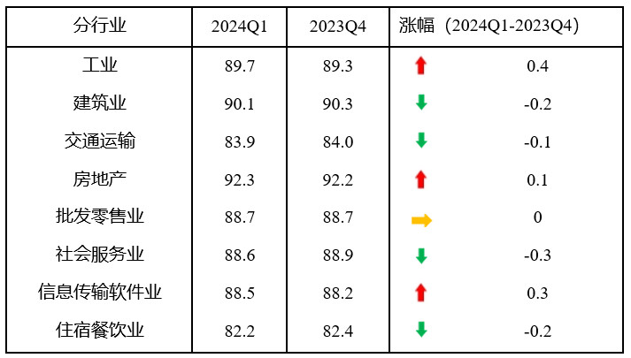 分行業(yè)指數(shù)3升1平4降。一季度,工業(yè)、房地產(chǎn)業(yè)和信息傳輸計算機服務軟件業(yè)指數(shù)比上季度分別上升0.4、0.1和0.3點,批發(fā)零售業(yè)指數(shù)持平,建筑業(yè)、交通運輸郵政倉儲業(yè)、社會服務業(yè)和住宿餐飲業(yè)指數(shù)比上季度分別下降0.2、0.1、0.3和0.2點,社會服務業(yè)指數(shù)降幅較大。8個分行業(yè)指數(shù)均處于景氣臨界值100以下。