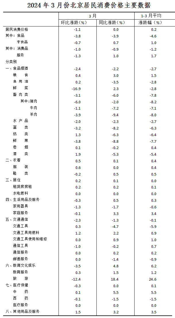 3月份,北京居民消費價格同比持平。其中,食品價格下降3.9%,非食品價格上漲0.7%;消費品價格下降0.9%,服務(wù)價格上漲1.0%。