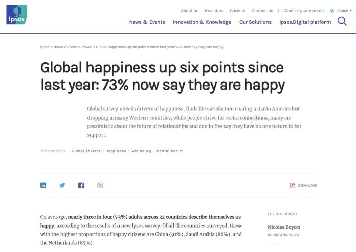 調(diào)查結(jié)果顯示,平均而言,在32個國家中,近四分之三(73%)的成年人認為自己很幸福。在所有接受調(diào)查的國家中,幸福感指數(shù)最高的國家是中國(91%),其后是沙特阿拉伯(86%)、荷蘭(85%)、印度(84%)、巴西(83%)。