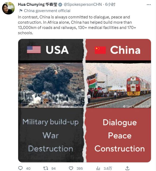 華春瑩接著在第二條推文中發(fā)了一張中美對比圖,圖中顯示美國沉迷于軍事建設(shè)、戰(zhàn)爭和破壞?!跋啾戎?,中國始終堅持對話、和平、建設(shè)。僅在非洲,中國就援建了1.3萬多公里公路和鐵路、130多個醫(yī)療設(shè)施、170多所學(xué)校?!比A春瑩說。