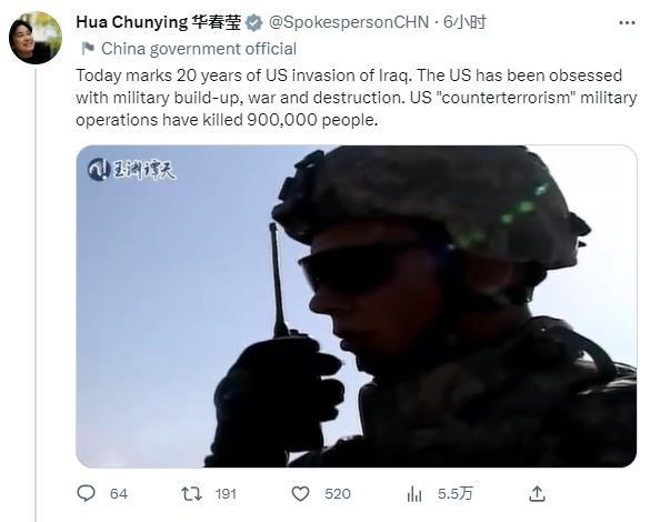 華春瑩在第一條推文中轉(zhuǎn)發(fā)了關(guān)于美國發(fā)動伊拉克戰(zhàn)爭的一個調(diào)查視頻,并配文稱,“今天是美國入侵伊拉克20周年。美國一直沉迷于軍事建設(shè)、戰(zhàn)爭和破壞。美國的‘反恐’軍事行動已造成90萬人死亡?!?/p>