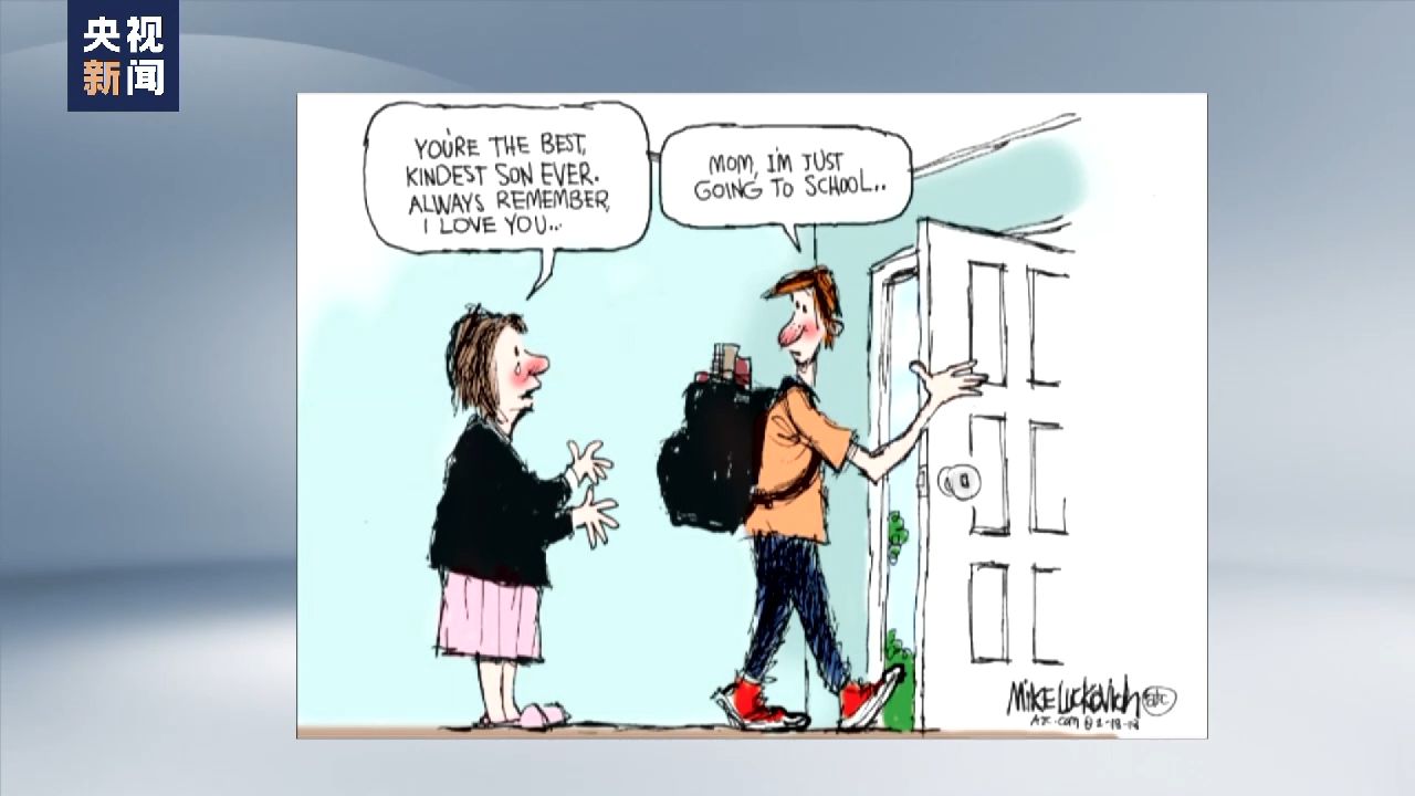 槍支暴力已經(jīng)成為美國(guó)孩子的“頭號(hào)殺手”。在這幅漫畫(huà)中,母親流著眼淚,對(duì)準(zhǔn)備出門(mén)上學(xué)的孩子叮囑道,“你是最好、最善良的兒子,永遠(yuǎn)要記得這一點(diǎn),我愛(ài)你?!?孩子則有點(diǎn)疑惑地說(shuō),“媽媽?zhuān)抑皇侨W(xué)校。” 這就是校園槍擊案頻發(fā)令無(wú)數(shù)父母終日膽戰(zhàn)心驚的真實(shí)寫(xiě)照。