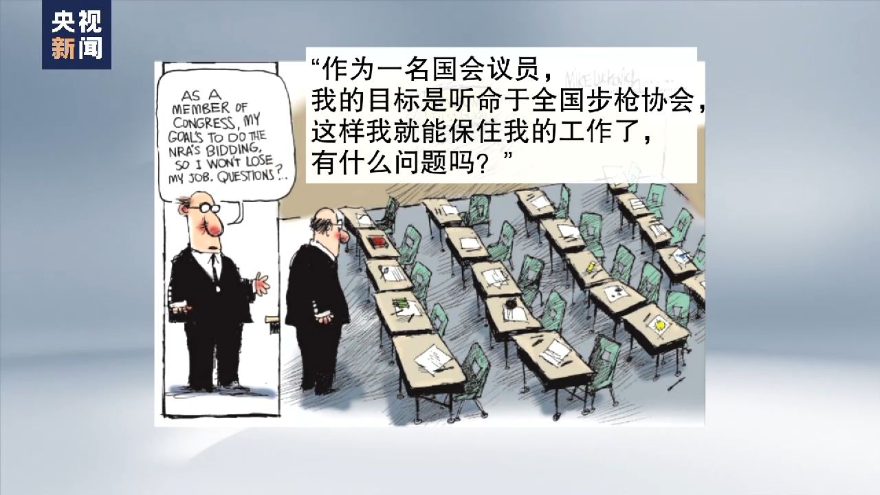 在另一幅漫畫(huà)中,在一間寫(xiě)有“紐敦市一年級(jí)”的教室里,擺放著二十張課桌椅,卻唯獨(dú)不見(jiàn)孩子的蹤影。漫畫(huà)左側(cè),這名來(lái)探視的議員心里想的是,“作為一名國(guó)會(huì)議員,我的目標(biāo)是聽(tīng)命于全國(guó)步槍協(xié)會(huì),這樣我就能保住我的工作了,有什么問(wèn)題嗎?”