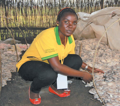 盧旺達(dá)國立大學(xué)的學(xué)生姍臺(tái)在菇棚中采收平菇。