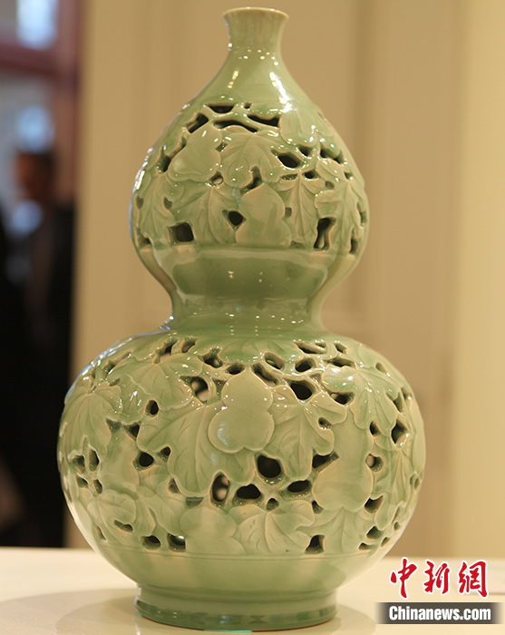 圖為展品《葫蔭綿長》,因其燒制難度大,是公認(rèn)的龍泉青瓷精品。 中新社記者 德永健 攝