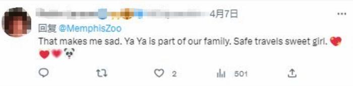 還有不少不能到現(xiàn)場(chǎng)的“丫丫”粉絲,在孟菲斯動(dòng)物園社交媒體賬號(hào)下留言,用暖心的話語(yǔ)和“丫丫”說(shuō)再見(jiàn)。