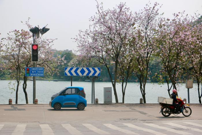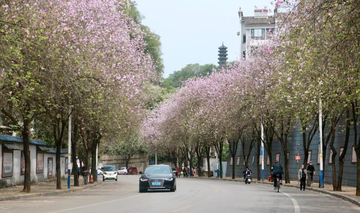 4月7日,廣西柳州市洋紫荊盛放,車輛在花海里穿梭。中新社記者 林馨 攝