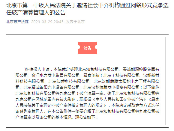 經(jīng)債權人申請,北京市第一中級人民法院裁定受理北京知旬科技有限公司、秉誠能源控股集團有限公司、金江水力發(fā)電集團有限公司、君泰創(chuàng)新(北京)科技有限公司、漢能新材料科技有限公司、北京知乘科技有限公司、北京漢能薄膜太陽能電力工程有限公司、北京精誠鉑陽光電設備有限公司、北京漢能薄膜發(fā)電投資有限公司破產(chǎn)清算一案。