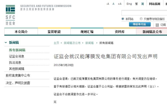 2015年5月28日,香港證監(jiān)會發(fā)表聲明稱,已就漢能薄膜發(fā)電的事務進行調查。2015年7月15日,漢能薄膜發(fā)電遭香港證監(jiān)會勒令停牌。