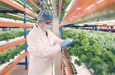 在阿聯(lián)酋迪拜阿勒馬克圖姆國際機(jī)場不遠(yuǎn)處,一棟四四方方、外觀簡約的辦公樓里,垂直農(nóng)場“我的菜園”里一派繁忙景象。