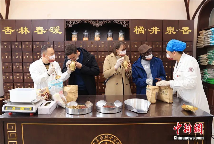 來自比利時、白俄羅斯和加納的外國友人在山東東營一家中醫(yī)醫(yī)院的中藥房識別、稱量中藥材。周廣學(xué) 攝