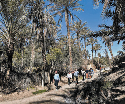 突尼斯西南部鹽湖附近的一處沙漠綠洲中,游客在棕櫚樹林中散步。