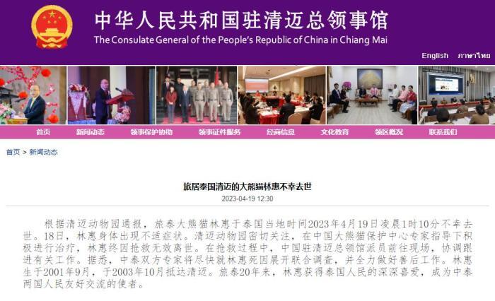 中國駐清邁總領(lǐng)事館消息稱,4月18日,“林惠”身體出現(xiàn)不適癥狀。清邁動物園密切關(guān)注,在中國大熊貓保護(hù)中心專家指導(dǎo)下積極進(jìn)行治療,“林惠”終因搶救無效離世。