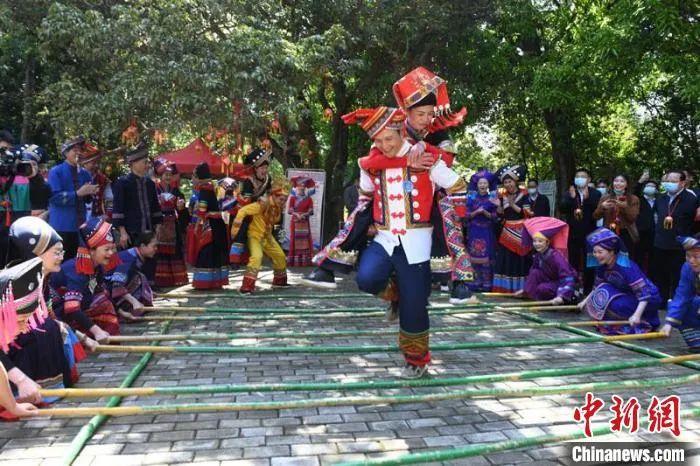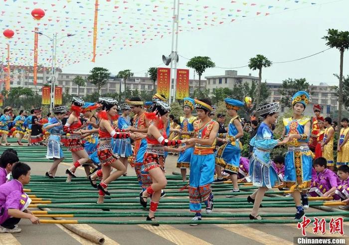 壯族民眾著盛裝歡跳竹竿舞。黃艷梅 攝