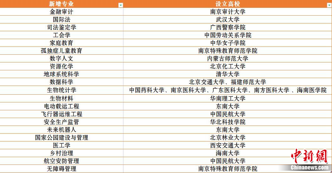 記者梳理發(fā)現(xiàn),21種新專業(yè)涉及10大類,包括金融審計(jì)、國際法、司法鑒定學(xué)、工會(huì)學(xué)、家庭教育、孤獨(dú)癥兒童教育、數(shù)字人文、資源化學(xué)、地球系統(tǒng)科學(xué)、數(shù)據(jù)科學(xué)、生物統(tǒng)計(jì)學(xué)、生物材料、電動(dòng)載運(yùn)工程、飛行器運(yùn)維工程、安全生產(chǎn)監(jiān)管、未來機(jī)器人、國家公園建設(shè)與管理、醫(yī)工學(xué)、鄉(xiāng)村治理、航空安防管理、無障礙管理。