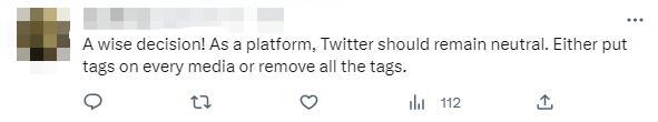 對推特的最新變化,有網(wǎng)友表示歡迎?!耙粋€明智的決定!作為一個平臺,推特應(yīng)該保持中立。要么給每個媒體上都打標簽,要么刪除所有標簽。”