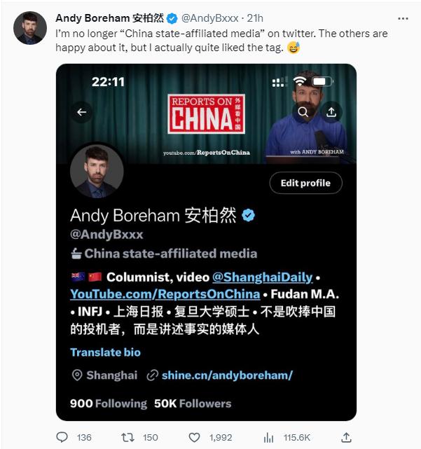 在上海工作生活了近10年的新西蘭媒體人安柏然寫道,“我不再是推特上的‘中國官方媒體’了。其他人對此很高興,但我其實很喜歡這個標簽?!?/p>